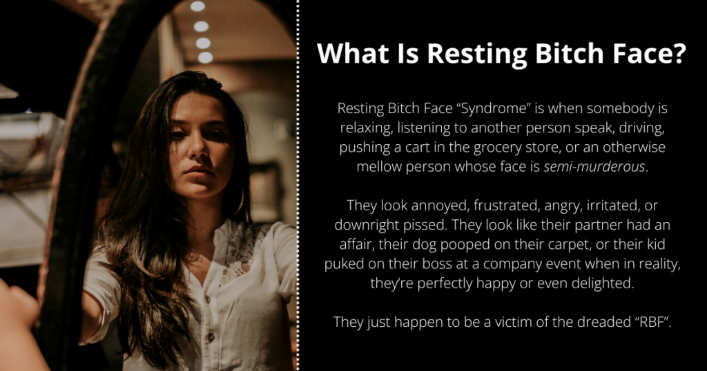 A Resting Bitch Face is an “unkind, annoyed, or serious expression that someone has on their face when relaxed, without intending to.”